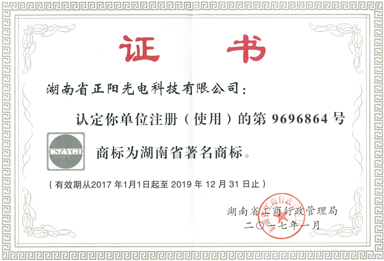2017年2月28日,湖南省正陽光電科技有限公司榮獲湖南省著名商標(biāo)。熱烈祝賀我公司榮獲湖南省著名商標(biāo)!