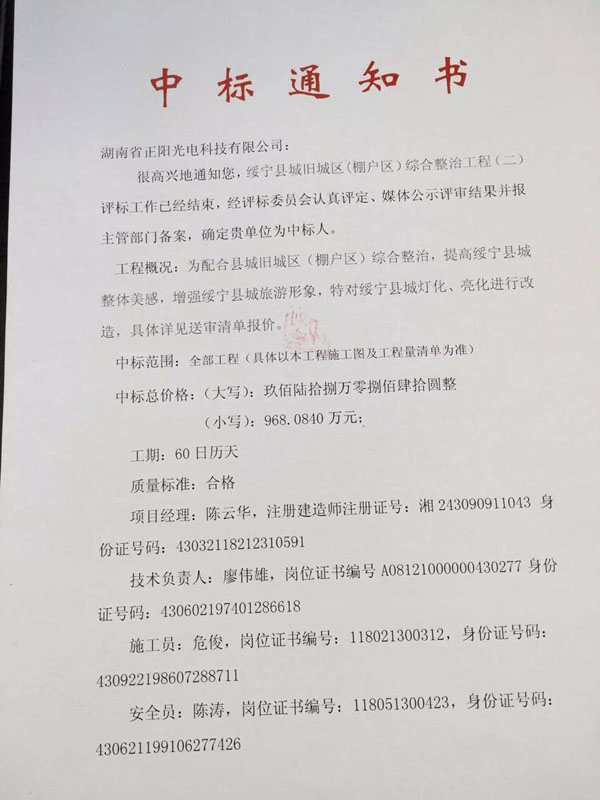 中標通知——熱烈祝賀湖南正陽成功簽約綏寧縣城舊城區(qū)(棚戶區(qū))綜合整治工程亮化工程(二)施工項目[2015-05-15]
