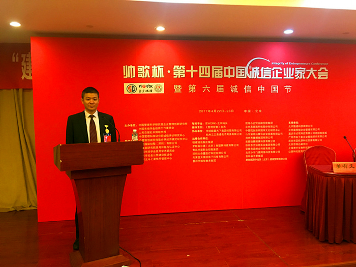2017年4月22日,第十四屆中國誠信企業(yè)家大會暨第六屆誠信中國節(jié)在北京人民大會堂、釣魚臺國賓館隆重舉辦。本次會議以“新常態(tài)下誠信建設與企業(yè)家精神”為主題,安排了經(jīng)濟學家特邀報告會、誠信建設大講壇、專題論壇、誠信標桿企業(yè)家盛會、企業(yè)對接合作洽談等多元活動。各有關領導、專家學者以及來自全球各地各行業(yè)企業(yè)家、商界精英、媒體等代表千余人,會議規(guī)模宏大,座無虛席,反響熱烈。